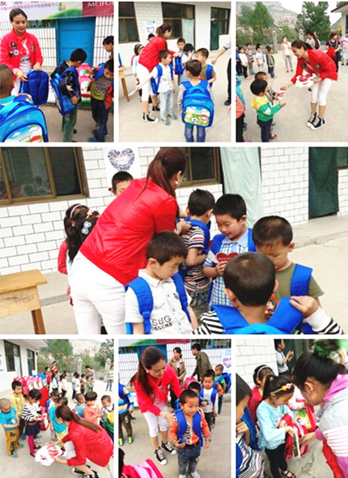 圖:美膚寶陽光計劃志愿者們給孩子們送去書包、課外書、愛心卡等禮物