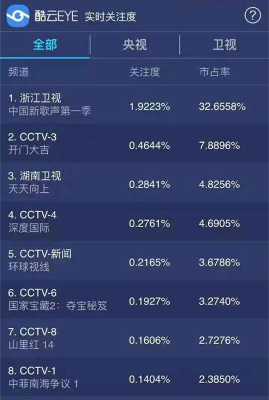 從“酷云EYE”的實時關注度數據來看,法蘭琳卡獨家冠名的浙江衛視《中國新歌聲》開播后實時關注度一直在飆升,截止節目結束前市場占有率高達32%,遠超第二到第十名的市場占有率總和!而同時段占有率排名第二的是CCTV-3,法蘭琳卡是CCTV-3的戰略合作伙伴,就在7月15日,法蘭琳卡的重磅精準投放實力盡顯,總體收視率達到了逆天的40%!屬于法蘭琳卡的“新歌聲”唱出了王者之勢,創造了傳播新巔峰!你是見證者嗎?