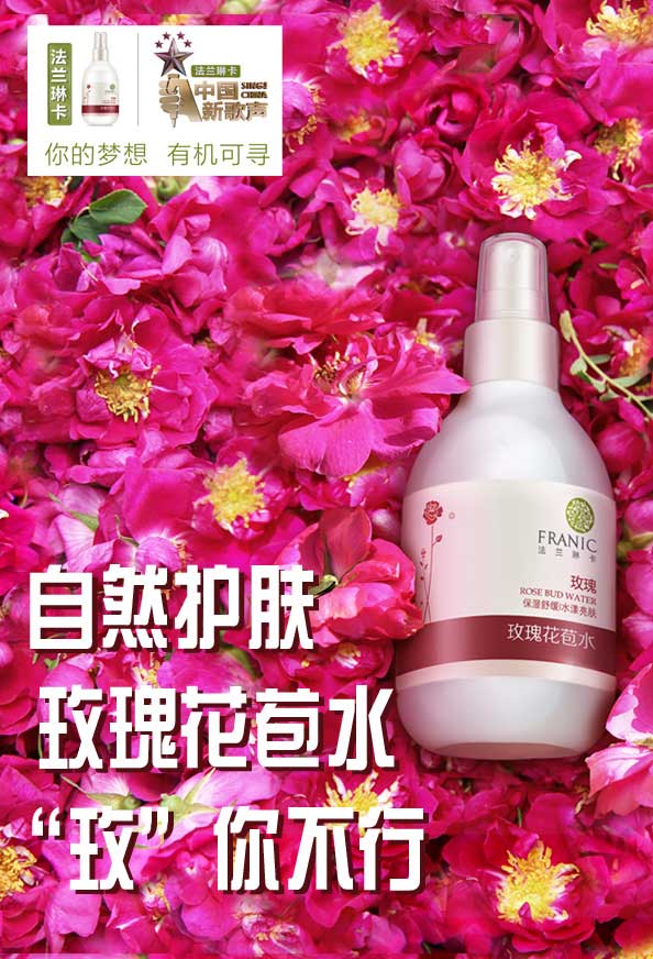 7月15日,法蘭琳卡獨家冠名《中國新歌聲》全球首播,再創傳播新巔峰!第一期《中國新歌聲》收視占有率超32%,法蘭琳卡玫瑰花苞水成為自然護膚、健康護膚的全新“代言人”,每一個支持原創、支持創新,支持法蘭琳卡自然護膚的你都是最棒的見證者!這個美好的夏天,和法蘭琳卡玫瑰花苞水在一起,讓你的夢想,有機可尋!