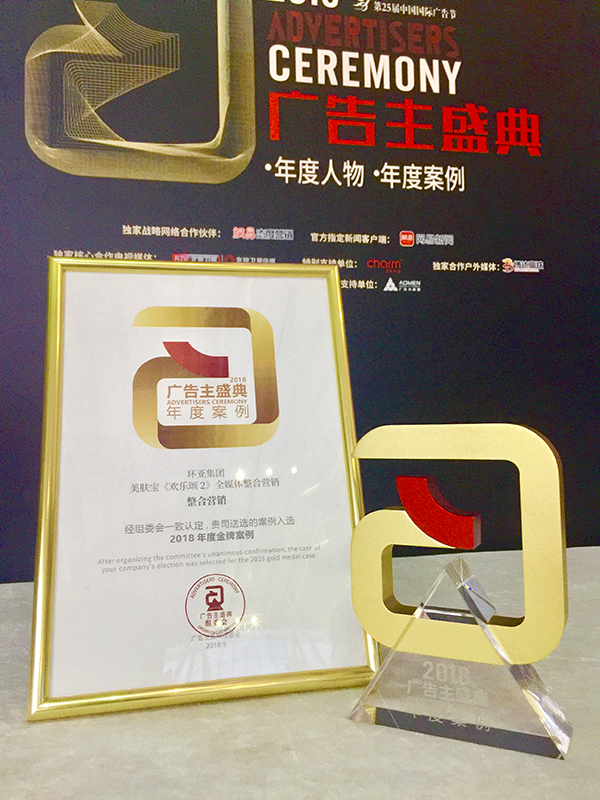 在9月28日舉行的中國國際廣告節2018年度廣告主頒獎盛典上,美膚寶經層層嚴格篩選入圍,憑借美膚寶《歡樂頌2》全媒體整合營銷榮膺“中國國際廣告節2018廣告主獎·年度整合營銷案例”。在2017年,美膚寶投放《歡樂頌2》獲得23億次的品牌線上曝光量,微博話題閱讀量超過7600萬次廣告年輕化擴大網絡主動曝光量,通過多種整合營銷方式贏得了消費者的關注與共鳴。