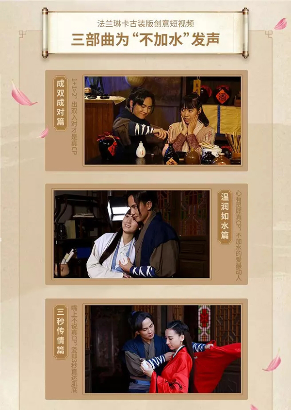 法蘭琳卡為深度挖掘產品+IP契合點,更全力打造古裝版創意短視頻三部曲為“不加水”發聲:分別是結合“玫瑰花苞水CP搭配功效1+1>2,清爽型喚醒肌膚、水潤型精華導入”的成雙成對篇視頻;結合“玫瑰花苞水取代普通去離子水,不加水”的溫潤如水篇視頻以及結合“玫瑰花苞水為肌膚快速補水”的三秒傳情篇視頻,引爆#誰是陳飛宇的真CP話題熱議。