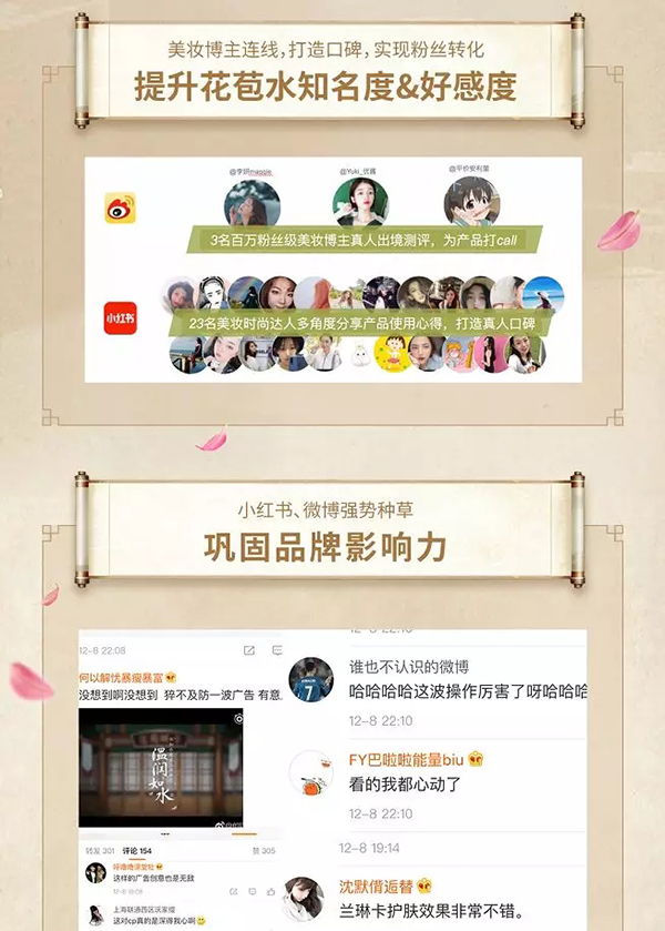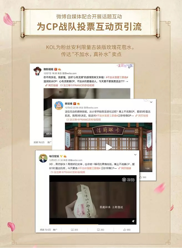 微博自媒體KOL配合開展話題互動,為CP戰隊投票互動頁引流,為粉絲安利限量古裝版玫瑰花苞水,傳達“不加水,真補水”賣點,實現粉絲轉化,提升玫瑰花苞水知名度及好感度。