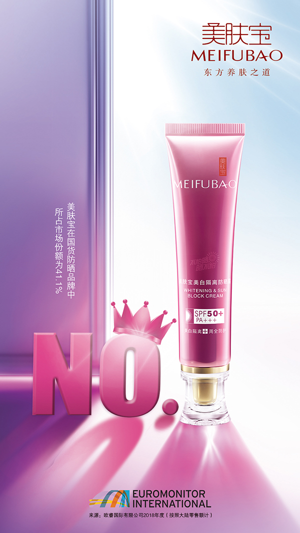 面對市場環境的風起云涌,挑戰與機遇并存,國貨品牌的崛起更是要抓住機會,乘風破浪迎風而上。作為國貨品牌的領導者,據最新的歐睿數據顯示,2018年美膚寶位列國貨防曬產品銷量第一名,所占市場份額為41.1%。自2017年起,美膚寶已經連續兩年被認證了國貨防曬NO.1的市場地位。目前美膚寶美白隔離防曬霜單品已突破5億元銷售額,可見其在防曬領域的專注與專業。