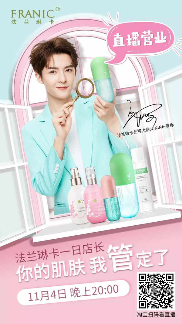 11月4日,法蘭琳卡趁勢將雙十一推到最高潮,精心策劃了一場以“你的肌膚,我管定了”為主題的直播活動,直播開始即吸引眾多粉絲火速圍觀。在一個多小時的直播中,法蘭琳卡品牌大使管櫟化身一日店長,與粉絲親密互動,以及頗具趣味的問答環(huán)節(jié),讓直播間刷屏不斷。法蘭琳卡甚至貼心設(shè)置了與管櫟店長直播打電話、贈送管櫟親筆簽名禮品等狂熱圈粉環(huán)節(jié),吸引粉絲瘋狂打call,直播氣氛一度飆升!