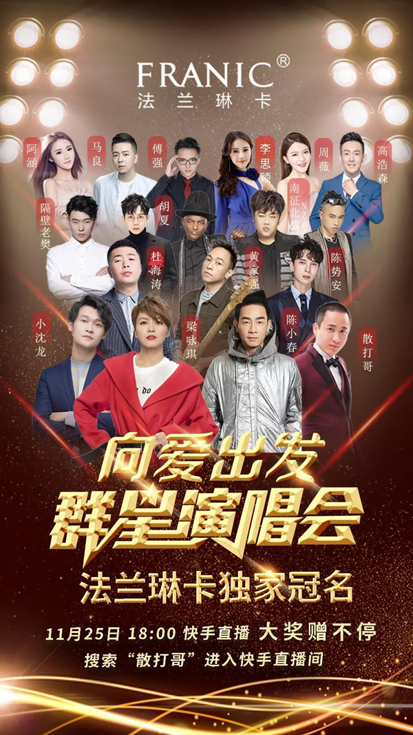 11月25號晚,由法蘭琳卡獨家冠名的“向愛出發(fā)”群星演唱會盛大開唱,群星匯聚為在場上萬粉絲帶來一場精彩的視聽盛宴,開場就燃爆近1740萬人氣。此次活動,創(chuàng)新的將明星演唱會加快手直播帶貨緊密結合,法蘭琳卡聯(lián)合坐擁4700W+粉絲的快手一哥“散打哥”,在強曝光的同時,更為品牌發(fā)聲帶貨,在雙十一后,創(chuàng)造了一波新的營銷高峰。
