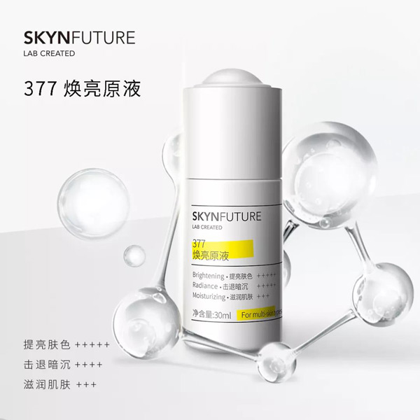 377煥亮原液主要成分377由全球知名原料公司德之馨研發(fā),是獲得SFDA(國家食品藥品監(jiān)督管理局)批準(zhǔn)的幾個新原料之一。作為新生代,377成分的獨(dú)特之處就在于它的作用原理。377成分能在源頭上抑制酪氨酸酶的活性,使黑色素?zé)o法生成。從而改善膚色不均,降低紫外線照射引起的皮膚著色。