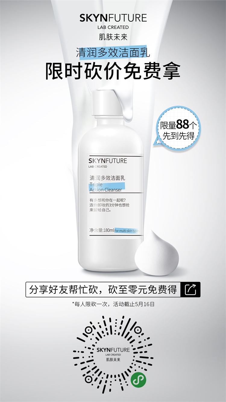直播開始前的預熱階段,肌膚未來云店推出0元砍價活動,由品牌投入88瓶清潤多效潔面乳,助力門店宣傳,號召會員參與。通過好友砍價到0元,即可到門店免費領取產品,活動上線參與會員數量超出預期。