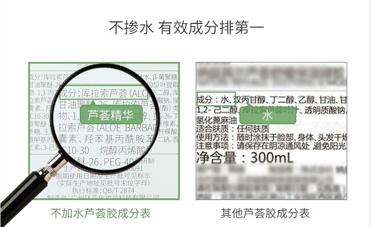 拿法蘭琳卡不加水蘆薈膠舉例: 一般化妝品都用水作為溶劑,成分表首位都是水,而法蘭琳卡蘆薈膠成分表首位是有效成分——庫拉索蘆薈葉汁水,整瓶蘆薈膠沒有添加一滴水。