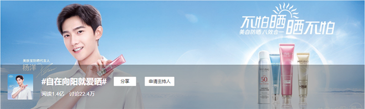 美膚寶傳承漢方養膚智慧,專研防曬22年,擁有不刺激發明專利和全波段抗紫外線關鍵技術,并獲得了中國輕工業聯合會科學技術進步獎與廣東省輕工業協會科學技術進步獎,是中國為數不多的同時獲得此兩項殊榮的化妝品品牌之一。美膚寶攜手千萬級粉絲防曬代言人楊洋,將“自在向陽就愛曬”的理念傳遞給更多消費者。美膚寶在微博、微信平臺放出官方宣傳視頻、海報等信息,吸引粉絲追蹤代言人的最新動態,持續與粉絲保持互動,將代言人流量轉化為潛在的品牌影響力。