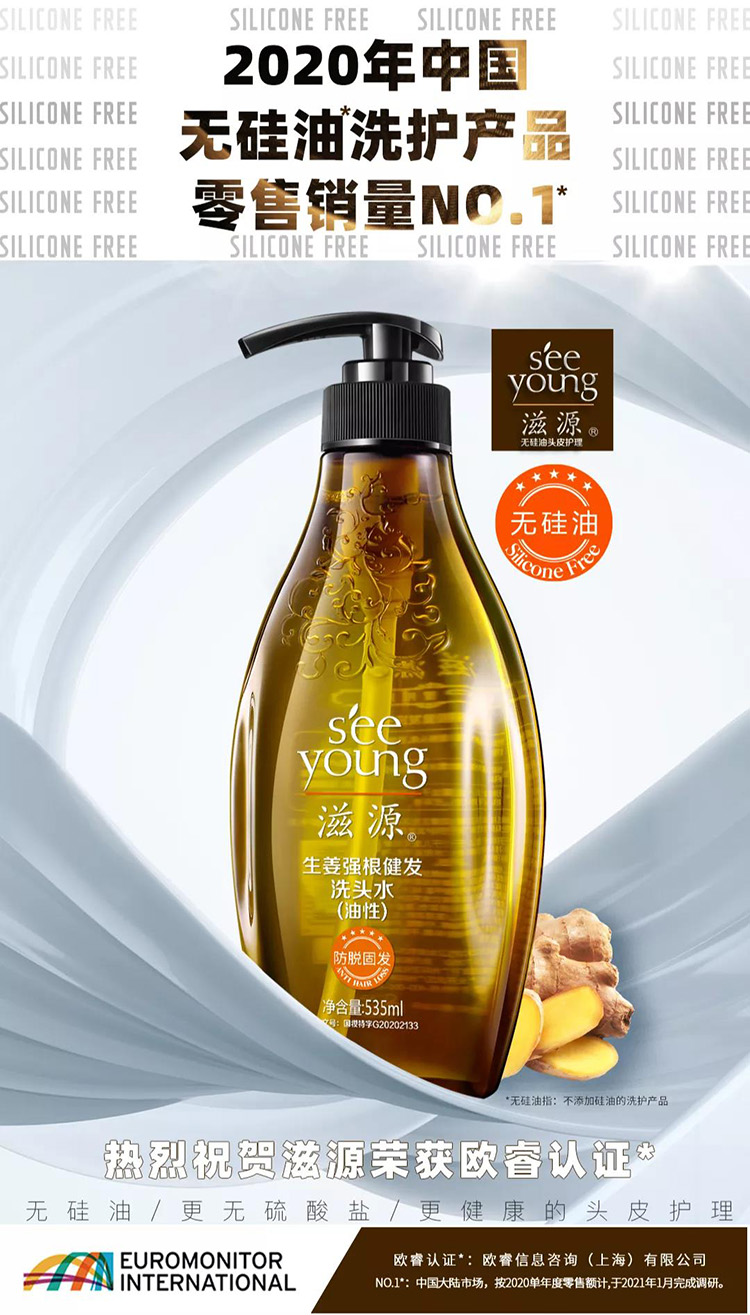 從一句“你洗了一輩子頭發,你洗過頭皮嗎”廣告來看,滋源無硅油洗頭水精準擊中了消費者的掉發、頭皮癢、頭屑等頭皮痛點,旨在推出健康頭皮護理理念,不斷地更新迭代產品,比如在成分篩選上,采用生姜、茶籽、無患子等對頭皮洗護有效成分,其中,生姜洗護系列一舉拿下國家育發類特證。在此之前,洗護市場尚未出現過類似成分的產品,而滋源的無硅油產品成分的推出,正是證實了滋源在洗護藍海市場中“第一個吃螃蟹的人”,隨著“無硅油”概念的深入人心,讓消費者一看到“無硅油”字眼,便會聯想到滋源。