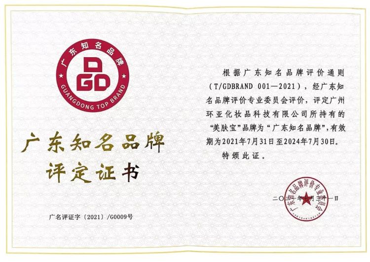 早在2021年8月,根據(jù)廣東知名品牌評(píng)價(jià)通則(T/GDBRAND 001-2021),經(jīng)廣東知名品牌評(píng)價(jià)專業(yè)委員會(huì)評(píng)價(jià),評(píng)定廣州環(huán)亞化妝品科技有限公司所持有的“美膚寶”品牌為“廣東知名品牌”。一個(gè)國(guó)貨品牌,如何成長(zhǎng)為行業(yè)百?gòu)?qiáng)與知名品牌,構(gòu)建品牌優(yōu)勢(shì)?從美膚寶品牌的發(fā)展鏈路中或許可以得到些許答案。