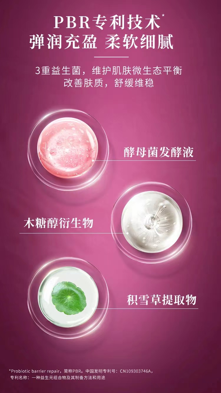 新品應用了環亞PBR益生元維護皮膚微生態專利技術1,可平衡微生態屏障,舒緩維穩肌膚。不僅如此,產品還延續了法蘭琳卡不加水配方,采用玫瑰花水為基底,添加三重酵母精粹,并運用Aquaxyl保濕技術,可快速有效的改善肌膚干燥缺水的問題。