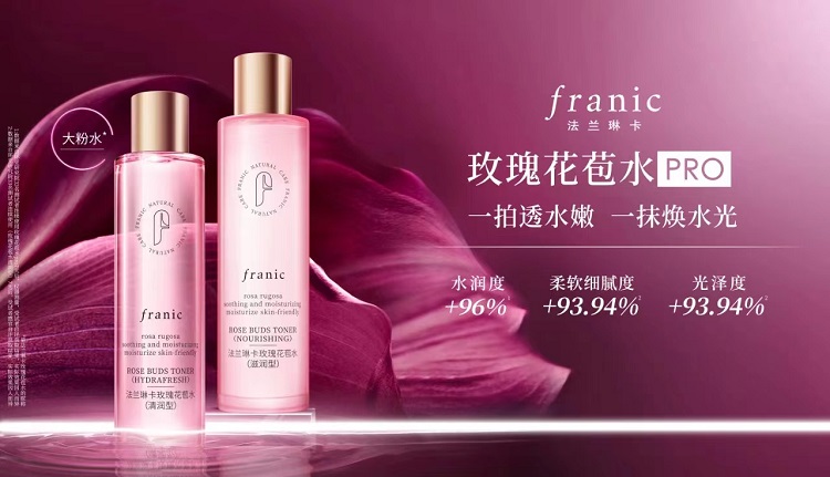 本月,法蘭琳卡推出升級后的玫瑰花苞水Pro,并計劃將此產品打造成為CS渠道爆品,以此打響2023年的開局之戰。新推出的玫瑰花苞水Pro從成分、膚感以及功效進行了全方位的升級,并推出油性肌膚適用的清潤型和干性肌膚適用的滋潤型。