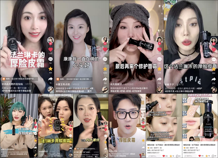 渠道上,法蘭琳卡采用“3+N”策略,“3”指的是傳統CS渠道、電商渠道和現代渠道(主要以屈臣氏為主),“N”指的是以社交電商為代表的新零售。在線上,法蘭琳卡發力興趣電商渠道,構建品牌自播、達人直播的完整直播營銷矩陣。今年法蘭琳卡自播迎來上升期,2022年每月業績逐月上升,達播方面,在8月份法蘭琳卡藍鉆凍齡緊致奢寵禮盒拿下抖音商品榜護膚套裝TOP1的好成績。