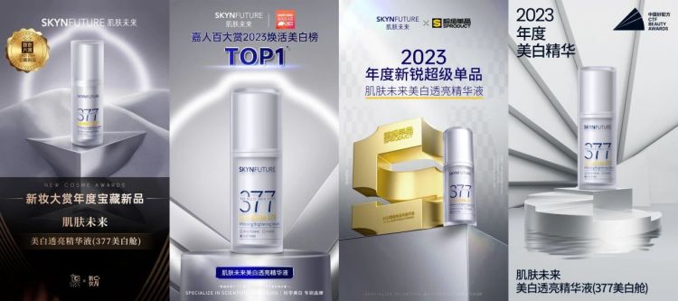 自2019年創(chuàng)立起,肌膚未來SKYNFUTURE一路穩(wěn)步前進(jìn),不斷突破行業(yè)新高度。據(jù)艾媒咨詢數(shù)據(jù)顯示:以2022-2023年全球377科學(xué)美白產(chǎn)品市場(chǎng)銷售額(元)占比排名統(tǒng)計(jì),肌膚未來SKYNFUTURE在國貨377科學(xué)美白產(chǎn)品中連續(xù)兩年全球銷量第一,獲得「377科學(xué)美白全球領(lǐng)軍品牌」認(rèn)證,已然成為377美白成分的代名詞。