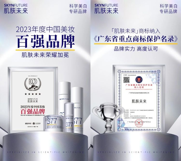 2024年5月,肌膚未來SKYNFUTURE被中國美妝網(wǎng)評(píng)為「2023年度中國百強(qiáng)品牌」;而「肌膚未來」也被廣東商標(biāo)協(xié)會(huì)重點(diǎn)商標(biāo)保護(hù)委員會(huì)納入《廣東省重點(diǎn)商標(biāo)保護(hù)名錄》。