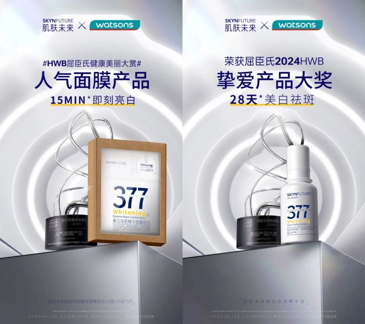 2024年8月,肌膚未來SKYNFUTURE分別憑借美白祛斑精華和美白祛斑精華面膜在屈臣氏HWB大賞中榮獲「摯愛產(chǎn)品大獎(jiǎng)」和「人氣面膜大獎(jiǎng)」獎(jiǎng)項(xiàng)。