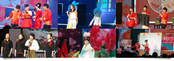 晚會于2月17日晚19:35分正式開始,整場晚會由何炅、李湘、謝娜、維嘉聯(lián)袂主持,晚會明星陣容強大,古巨基、蔡依林、阿SA、蕭敬騰、龔琳娜、丫蛋夫婦等親力加盟。美膚寶全國VIP客戶與眾明星近 距離接觸,現(xiàn)場見證了阿SA、蔡依林、旭日陽剛、龔琳娜等的非凡唱功,領略了何炅、謝娜、郭冬臨及趙本山徒弟丫蛋夫婦的搞笑功力,更有喜樂英雄帖喚上來的各民間藝人的精彩表演,均給美膚寶全國VIP客戶留下了深刻印象,大家與眾明星熱情互動,特別是當阿SA、蔡依林、旭日陽剛等當紅明星出現(xiàn)在舞臺時,大家情緒高昂,紛紛向自己喜愛的明星獻花及所要簽名。當整場晚會結束后,更有客戶在現(xiàn)場合影留念,用相機記下這一難忘的時刻。