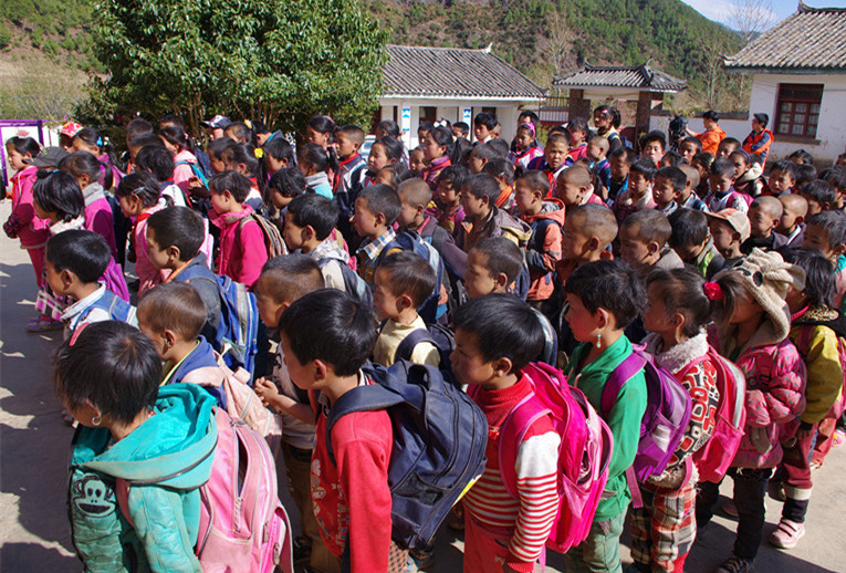 當志愿者來到羊安山完小時,正值孩子們在操場列隊。雖然是春暖花開的時節,但寧蒗四月的空氣中仍帶著幾分寒意,工作人員都裹著沖鋒衣保暖。而孩子們腳上只穿了被磨破了后跟的拖鞋,長袖外套上面套著短袖T恤也成了一種“時髦”的御寒方式,深褐色的小臉蛋上有一道道皴裂的痕跡,但洋溢著的確是喜悅與知足!