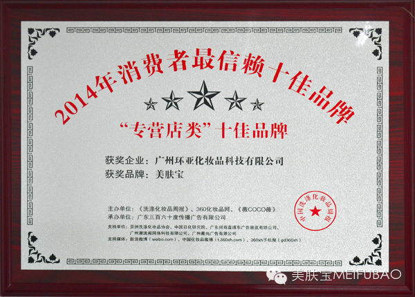 近日,由業內知名專業期刊《洗滌化妝品周報》、《薇COCO薇》和360化妝品網主辦的“2014年消費者最信賴十佳品牌”評選活動已落下帷幕,環亞集團旗下品牌美膚寶榮獲“2014年消費者最信賴十佳品牌”的“專營店類”稱號。
