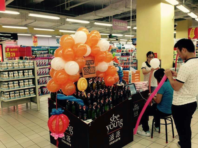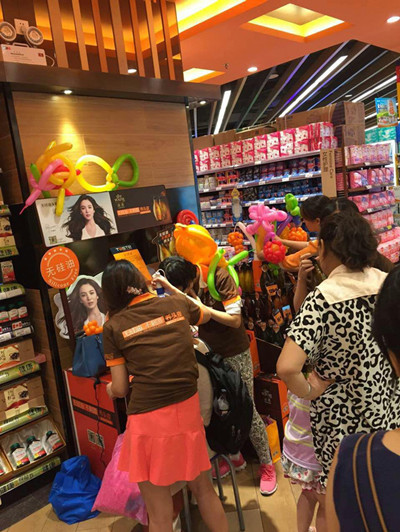 趕赴賣場,大家群策群力、發(fā)揮創(chuàng)意,為了使陳列更加惹人耳目,學(xué)員們紛紛上網(wǎng)下載編織氣球的視頻,現(xiàn)學(xué)現(xiàn)賣,巧妙地用氣球裝飾堆頭,將產(chǎn)品分類而后有層次整齊地?cái)[放到貨架上,搶眼而別致。