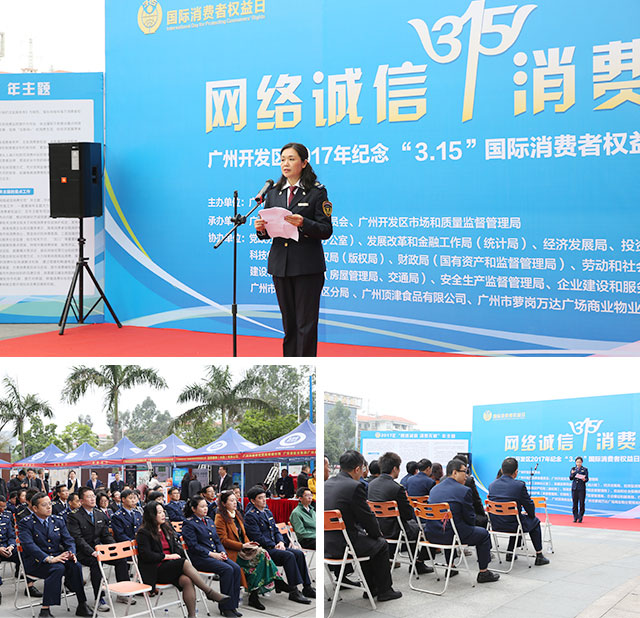 此次3•15展會以“網絡誠信、消費無憂”為年度主題。目前以電子商務為主要內容的網絡經濟發展迅猛,成為我國經濟增長的強勁動力,對擴大消費、拉動經濟增長、實現消費者自主選擇消費發揮了不可替代的作用。而網絡消費領域侵害消費者合法權益問題也日益凸顯,制約了網絡經濟的健康發展和“互聯網+”發展戰略的實施。廣州開發區市場和質量監督管理局鄭艷明副局長現場講話時表示,“網絡誠信消費無憂”年度主題,是對網絡經濟中損害消費者權益、不誠信經營行為的抵制,也是對建設放心無憂網絡消費環境的呼喚。