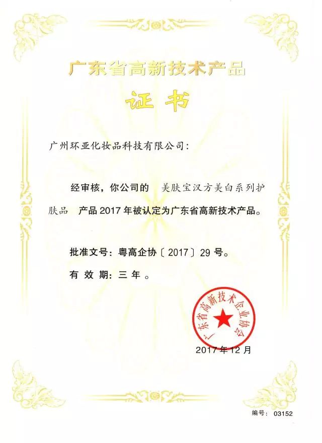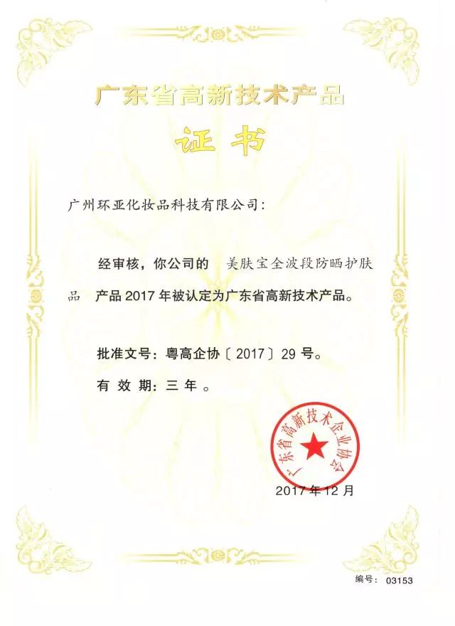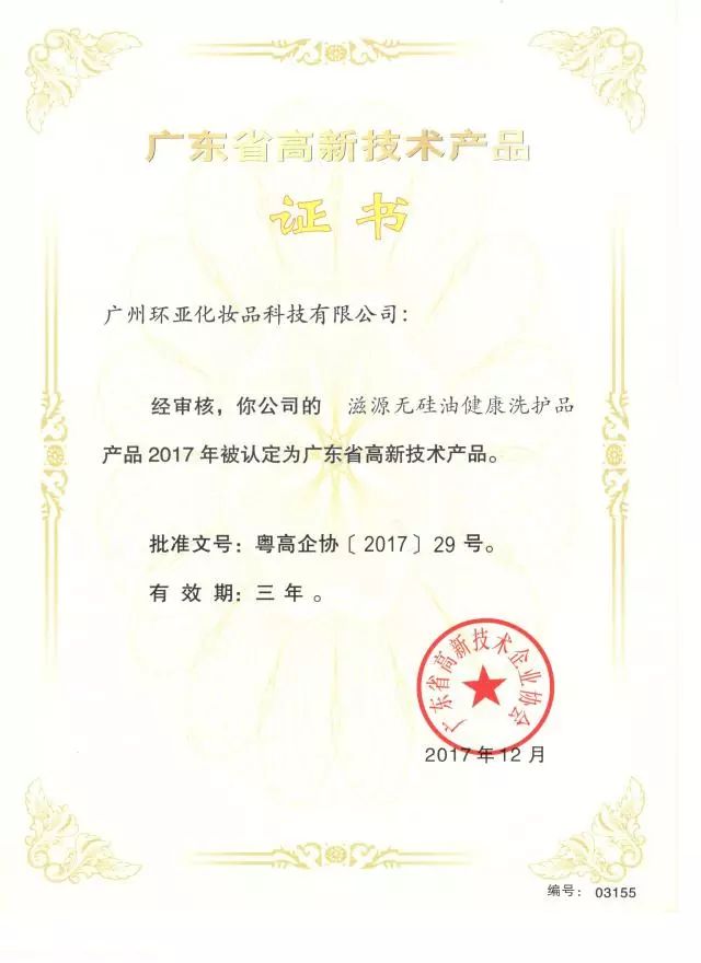 近日,廣東省高新技術企業協會頒布了2017年廣東省高新技術產品認證名單,環亞集團旗下品牌美膚寶、法蘭琳卡、滋源分別獲此殊榮:
