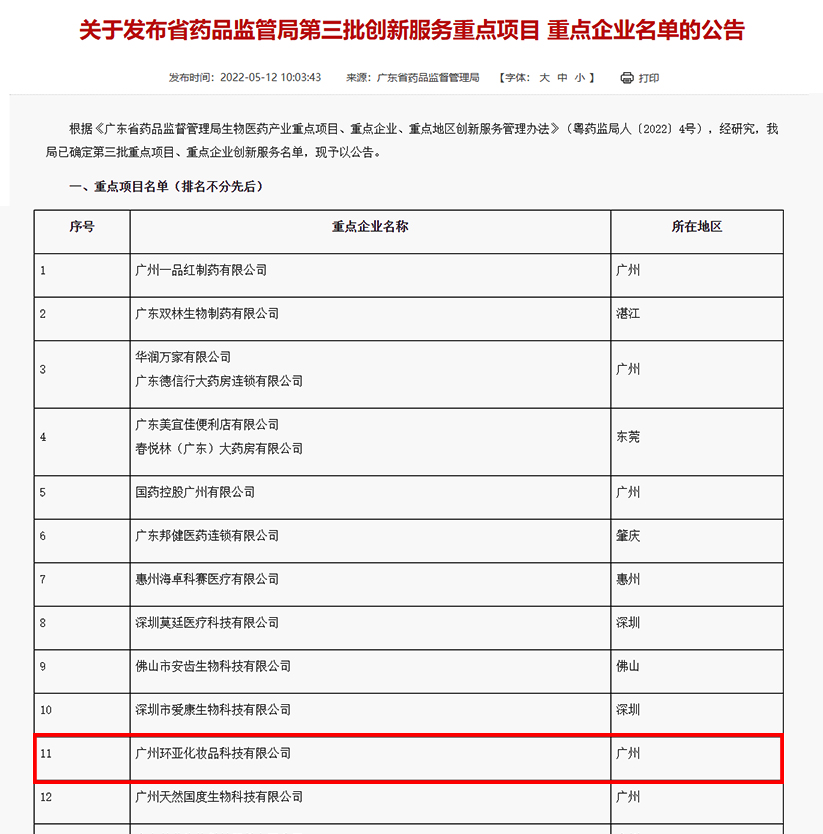 近日,廣東省藥品監督管理局召開專題新聞發布會,發布了第三批26個“三重”(生物醫藥產業重點項目、重點企業、重點地區)創新服務名單。環亞被列為“重點企業”名單。