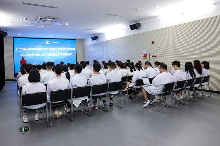7月20日 ,廣州環亞化妝品科技股份有限公司(以下簡稱環亞)科學技術協會2023年全體科技工作者政治學習專題會議在環亞研究院隆重舉行。此次會議的召開旨在提高公司科技工作者的政治領悟力、判斷力、執行力,激發廣大科技工作者的榮譽感、自豪感、責任感和使命感。