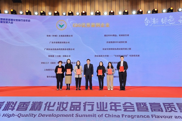 11月26日,2023香料香精化妝品企業ESG發展論壇在山東濟南舉行,并發布了2023年度ESG優秀實踐案例,環亞申報的“環亞可持續綠色供應鏈的發展之路”案例,入選“2023香料香精化妝品企業ESG優秀案例”。環亞集團副總裁陳亮應邀參加活動并上臺領獎。