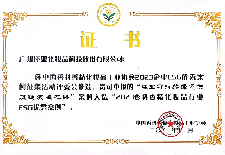 為引導更多香料香精和化妝品企業深入貫徹ESG理念,推動ESG由理念轉化為行動,挖掘企業ESG的創新實踐,中國香料香精化妝品工業協會及其ESG專委會,面向行業內所有企業發起“2023企業ESG優秀案例征集”活動。經過案例初選、專家評審、實地調研等,遴選出具有創新性、代表性和推廣性的典型案例。成功入選“2023香料香精化妝品企業ESG優秀案例”,標志著環亞的ESG管理與可持續發展得到多方的認可。