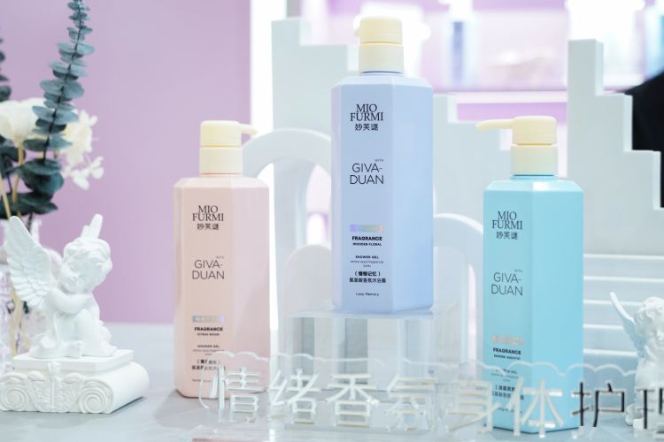 妙芙謎MIOFURMI此次展出將于7月上市的新品主要聚焦在凈、潤、亮、香這幾個核心沐浴產品功效,以香精的調配法則和測試方法引入情緒香氛療愈的前沿理念,添加泛醇、4D玻尿酸、果酸、煙酰胺精華等科技成分實現了情緒愉悅的沐浴體驗。