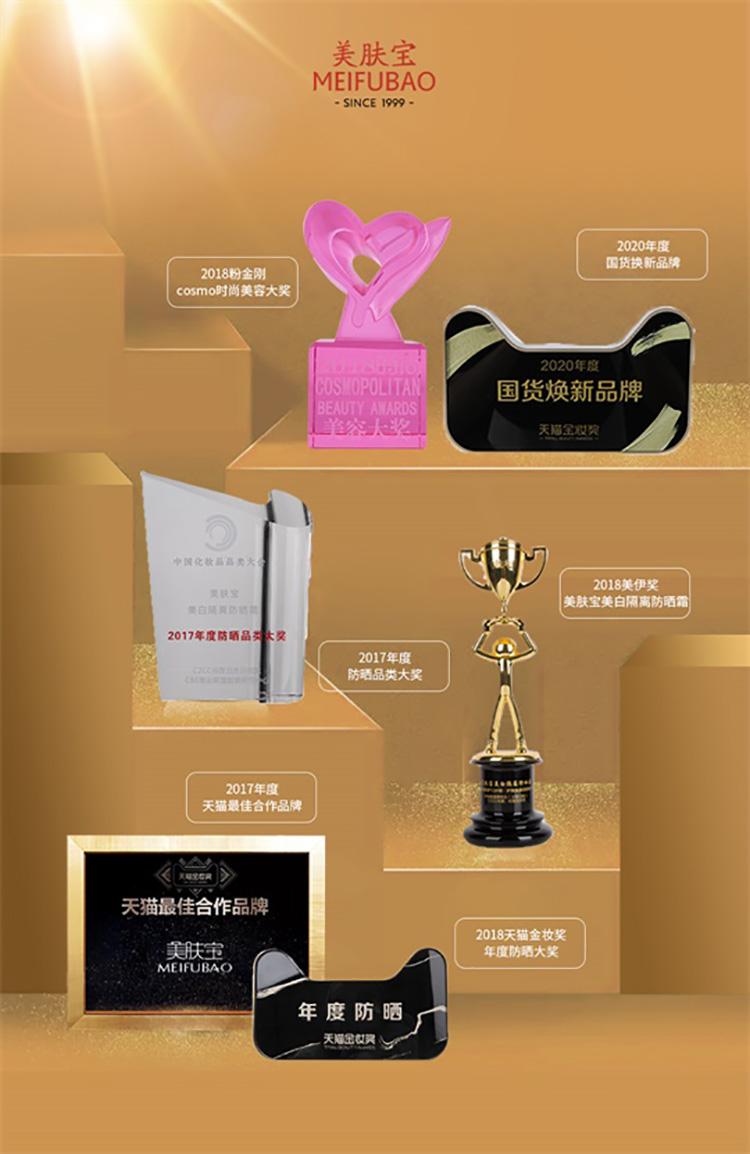 From the birth of the brand, after entering Tmall in 2011, Meifubao has occupied the No. 1 position in the sunscreen category on Tmall for 6 consecutive years and established a leading position in the sunscreen category. In addition, according to Euromonitor data, in 2017 and 2018, Meifubao also won the first prize of domestic sunscreen products. The gold content of this data is self-evident. In addition to receiving relevant awards from Tmall for its sunscreen products in 2015 and 2018, the label of sunscreen has been deeply embedded in the brand gene of Meifubao.