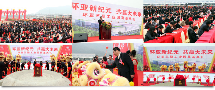 ON January 3, 2012, Guangzhou Huanya Cosmetics Technology Co., Ltd. Phase III Industrial Park was held in the new plant in Guangzhou Science Town. Huanya Group founder Mr. Hu Xingguo, Ms. Wu Zhiqing, Vice President Tang Youyue, Hua Chuanhai, South Korean Nabion Institute Chairman Jin Guizhi, Huanya Cosmetics agencies and suppliers, Huanya Research Institute staffs, Huanya Cosmetics Meifubao, Franic, Leila staffs altogether 3500 persons witted the excited moment. Huanya Phase III Industrial Park occupies an floor area of 120,000m2 and is 1.66 times bigger than the total floor area of Phase I and II.